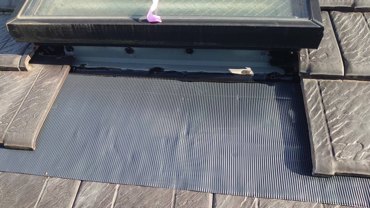この瓦があることでエプロンの勾配が緩くなり、エプロンの上に窪みが出来ます。その窪みに雨水が溜まり、残り易くなります。溜まった水がエプロンの亀裂から浸水したり、トップライトの方に逆流するのです。