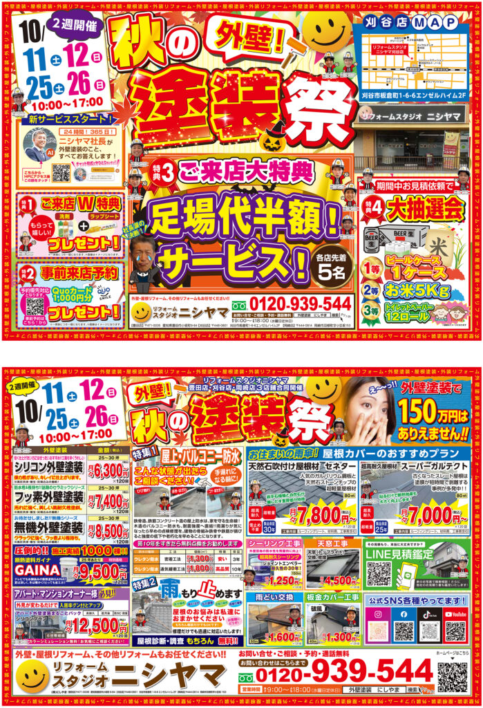 10/11㊏12㊐,25㊏26㊐の4日間限定で、3店舗同時開催の秋の外壁塗装祭を開催いたします!