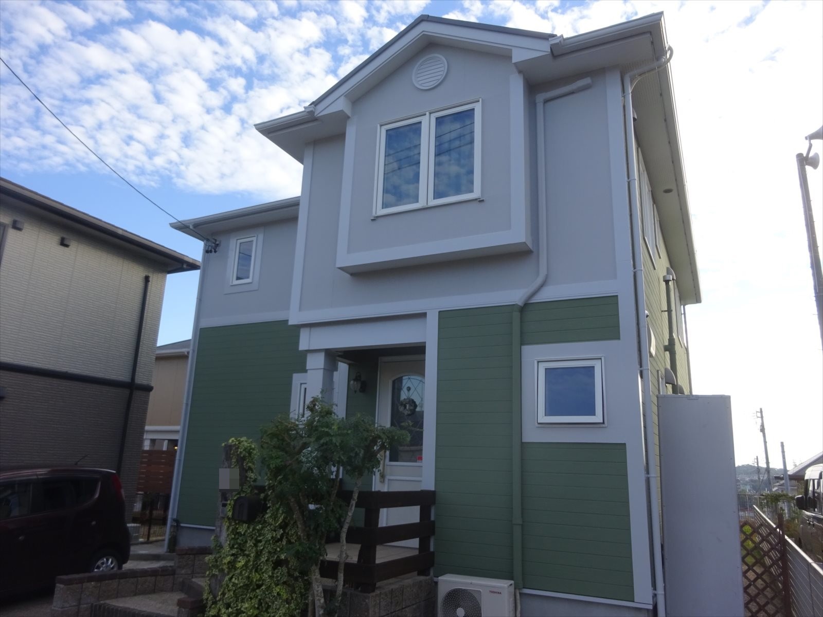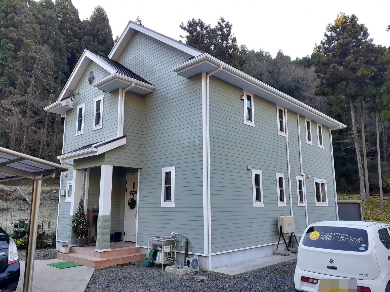 愛知県豊田市にて築13年の戸建て住宅の外壁塗装工事を行いましたのでご紹介します。使用した塗料は断熱塗料ガイナです。以前とは大きく色合いを変えてグリーン色にしました。