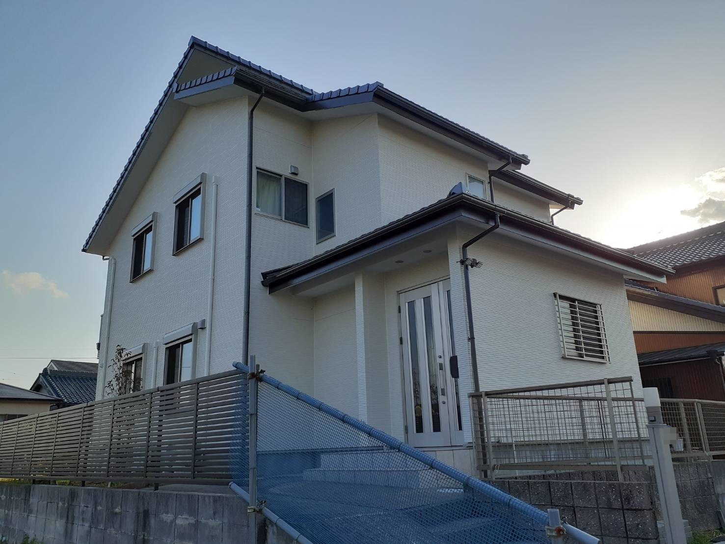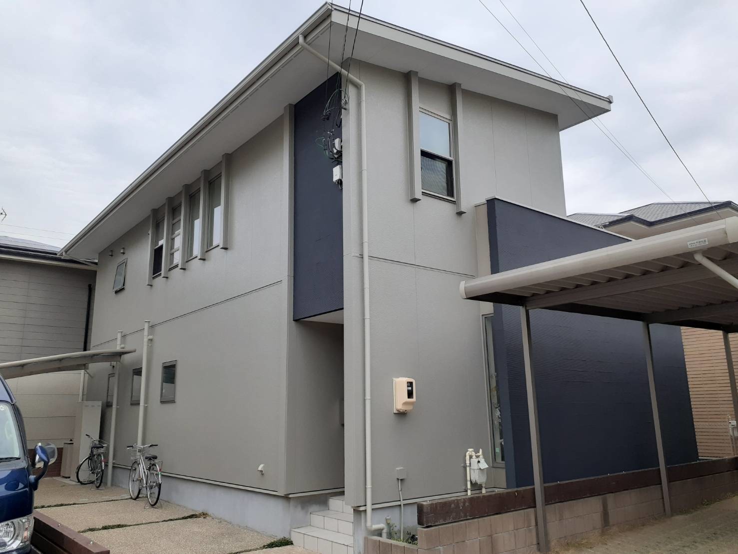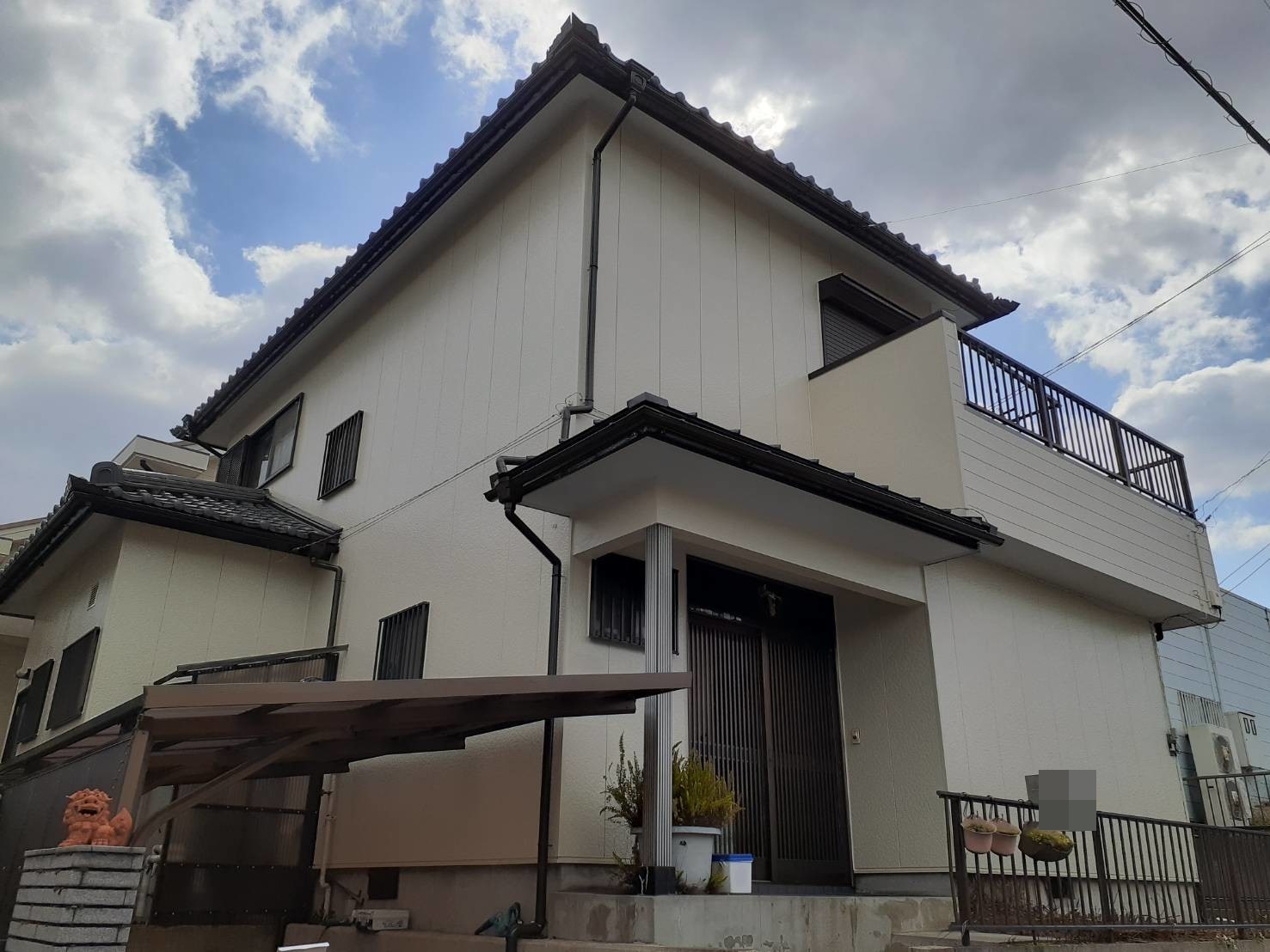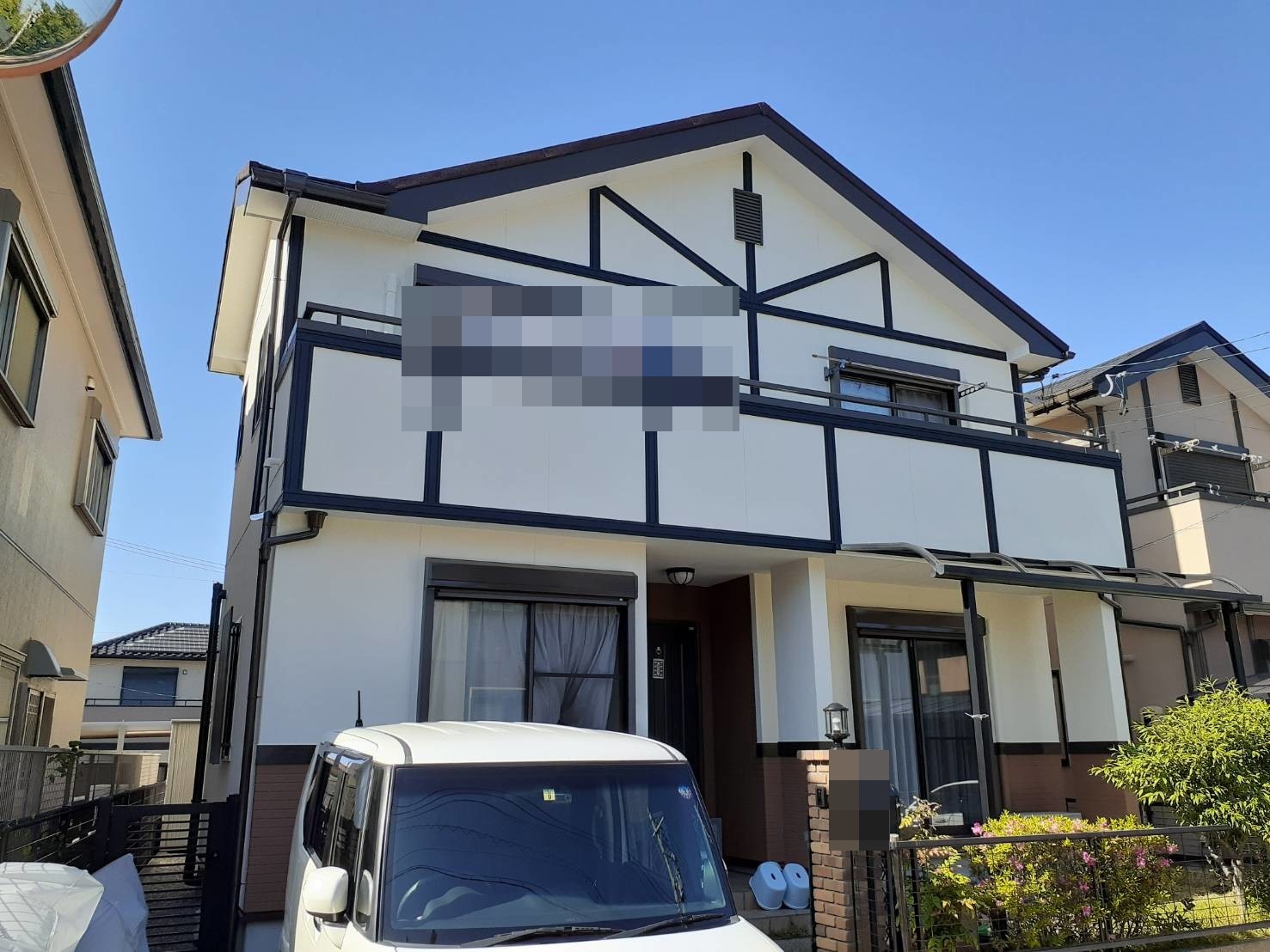 洋風の建物によく使われる大壁といわれる目地の少ない外壁。漆喰の様な仕上がりの艶の無い仕上げがとてもよく似合い、今回もジョリパッドインフィニティという艶消しの外壁用塗料を使用しました。以前のイメージとは大きく変更し外壁と塀を同色で塗装することによりより洋風なイメージに仕上がりました。