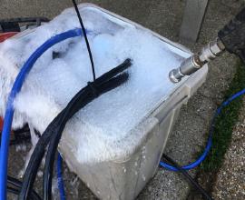 人間でもお風呂に入った際や洗顔の際には必ず石鹸を使いますね。水洗いのみ高圧洗浄)で汚れを落とそうとすると水圧を必要以上に高圧にする場合があり、適切な水圧を保ちカビや汚れの原因となる「菌」まで根こそぎ洗浄します。