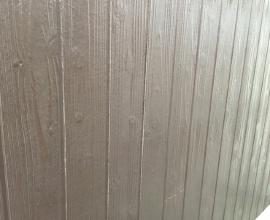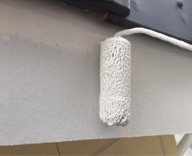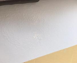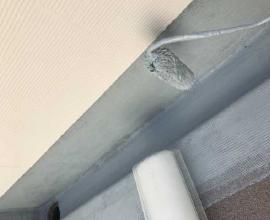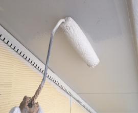 軒天の仕上げ塗装工事です。上裏(あげうら)とも表現します。外壁塗装とは異なり湿気の帯びやすいこの部分にはカビの生えにくい専用塗料で塗装します。塗料の粒子が細かく基材に浸透しやすいため高い吸着力があり目地や釘頭などを目立ちにくくする効果もあります。