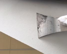 水切りとはサイディングなどの外壁材を貼り付ける前に取り付ける部材で、万が一外壁材の中に水分が侵入してもサイディングの最下部から建物外部に水分を排出させるための部材です。 ガルバリウム鋼板製のものがほとんどですが取り付けられていない建物も存在します。稀に見受けられるのがこの部分にコーキングを打ってしまっている案件。良かれと思って施工したのでしょうがこれでは 逆効果どころか建物の劣化を促進させてしまう大きな要因となりますので注意して下さい。この水切りを外壁と同じ色に塗装することで手間が省けますが見た目としてはあまり宜しくありませんので手間はかかりますが刷毛で綺麗に塗装することで美観性も保たれます。