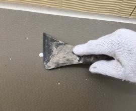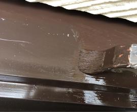 庇は鋼板製のものが多く、雨戸やシャッターボックスと同様に塗装します。中には雨だれが庇の上に落ちて「トントン」という音が気になる場合は特殊な塗料を使用することで不快な音を軽減することが可能です。時々ハウスメーカーに見られる 塩ビ鋼板を使用している場合は通常の下処理では剥離の原因となるため専用のプライマー処理をした後に塗装をします。