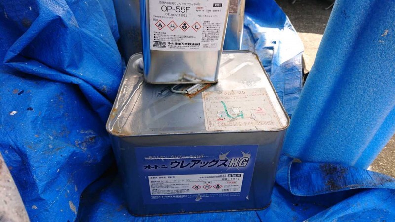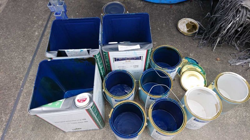 官公庁の物件では必ず行われる材料検収です。実際にその現場で使用した材料を写真に収め、見積もりと相違がないかを確認します。また塗装面積に対し必要缶数も算出できるため規定塗布量通りに工事が行われたかも確認することが可能です。