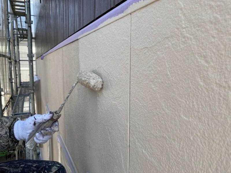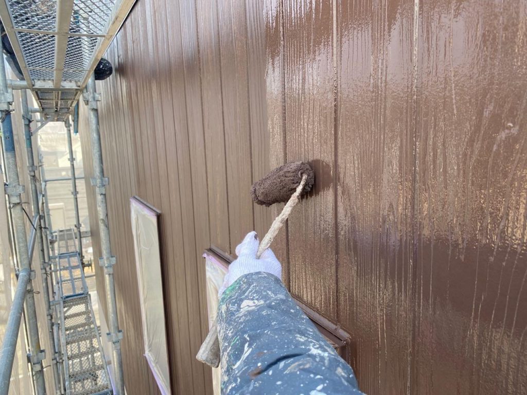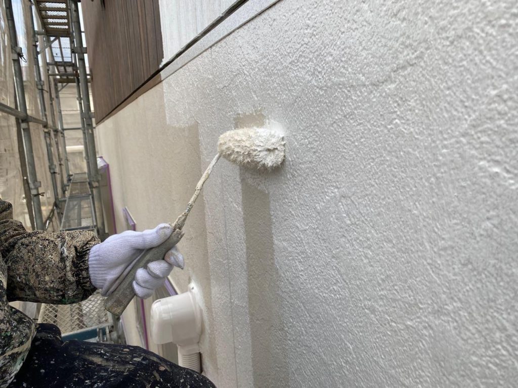 現在ではほとんどの場合ローラーで施工します。外壁の形状や塗料の種類によっては吹き付け塗装を行う場合もありますがリフォーム工事や改修工事の場合、近隣が隣接しているケースが多いことから塗料飛散を防止するためにもローラー仕上げが主流となります。吹き付け塗装よりもローラー施工のほうが塗装の膜厚(塗膜)が厚くなるため外壁保護の観点からすると優位性があります。平滑な面への塗装などは吹付けを行うこともあります。